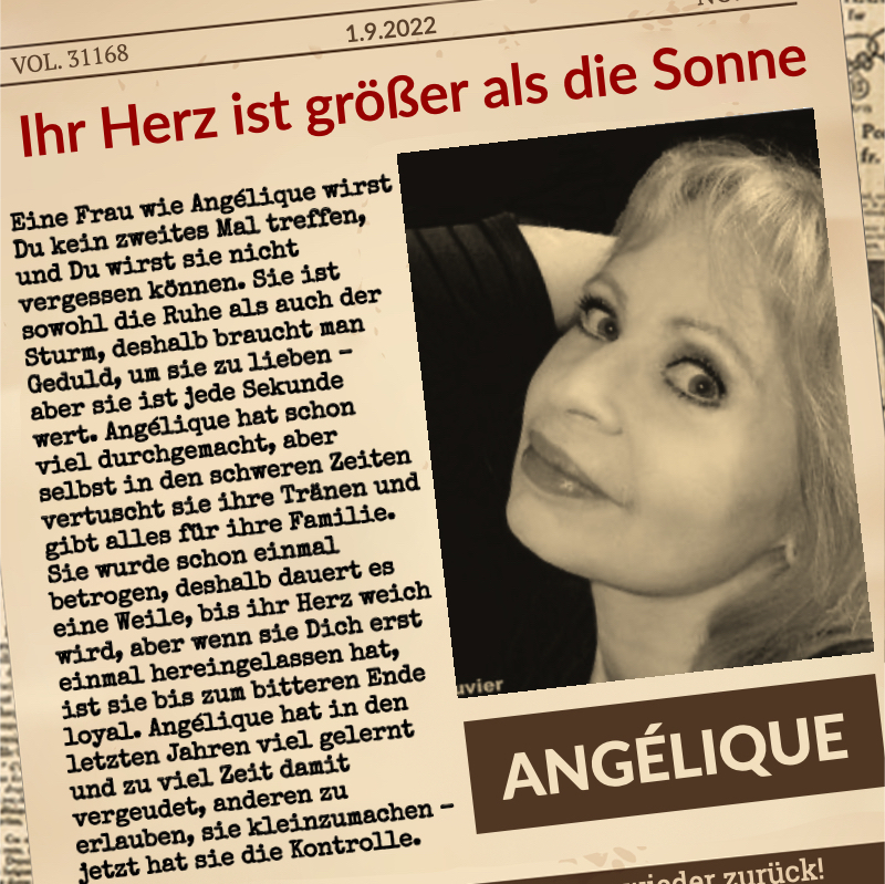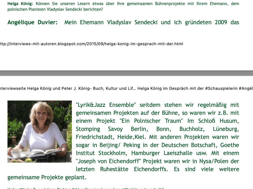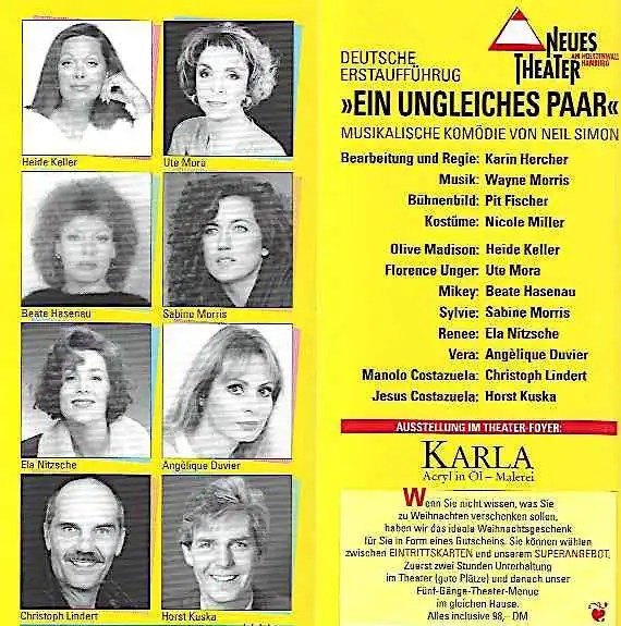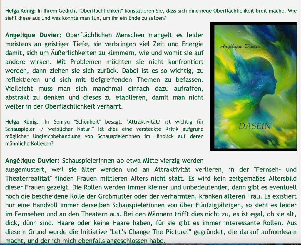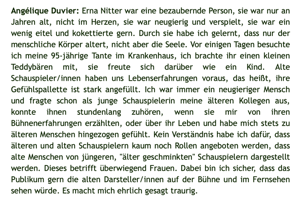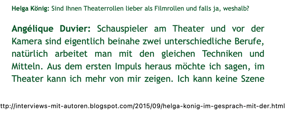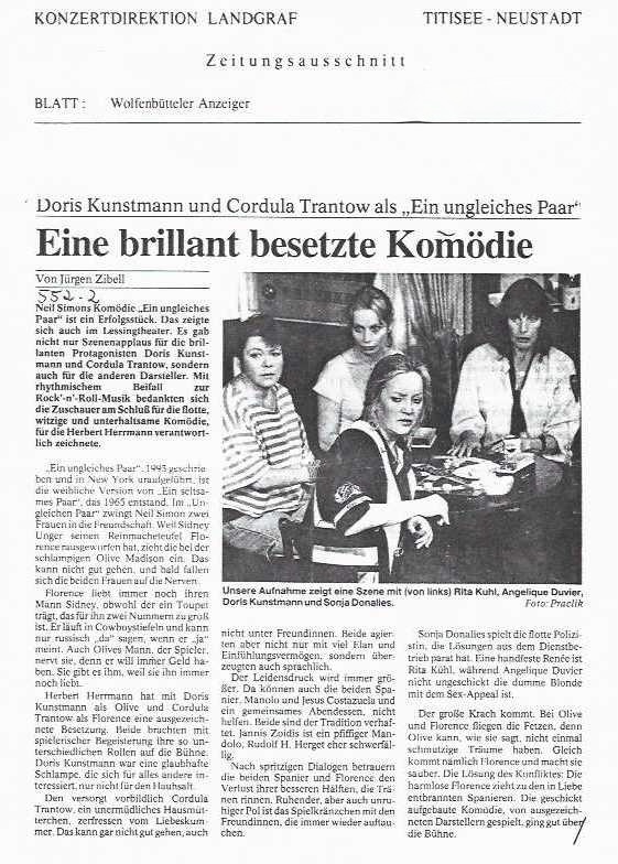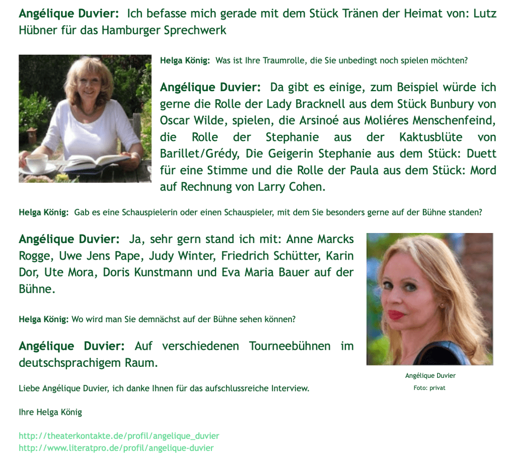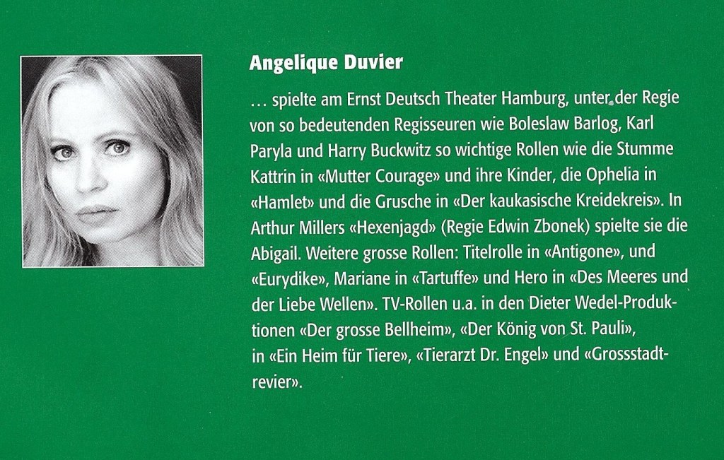 Hamburger Abendblatt Interview 17.02.2024 Augustheater – Neu -Ulm – PocketKlassiker Biennale Der König von St. Pauli – Angélique Duvier in der Rolle der: Mona Angélique Duvier und Hilmar Thate in dem Fernsehmehrteiler: Der König von St. Pauli. Regie: Dieter Wedel Ein ungleiches Paar – Mit: Heide Keller, Ute Mora, Beate Hasenau, Angélique Duvier, Horst Kuka u.a. Regie: Karin Hercher