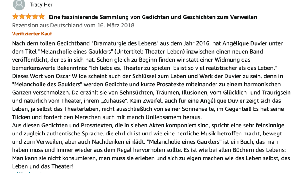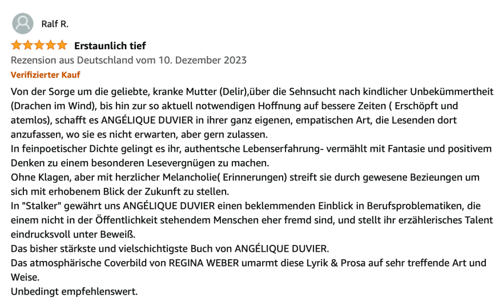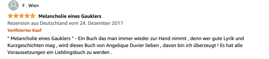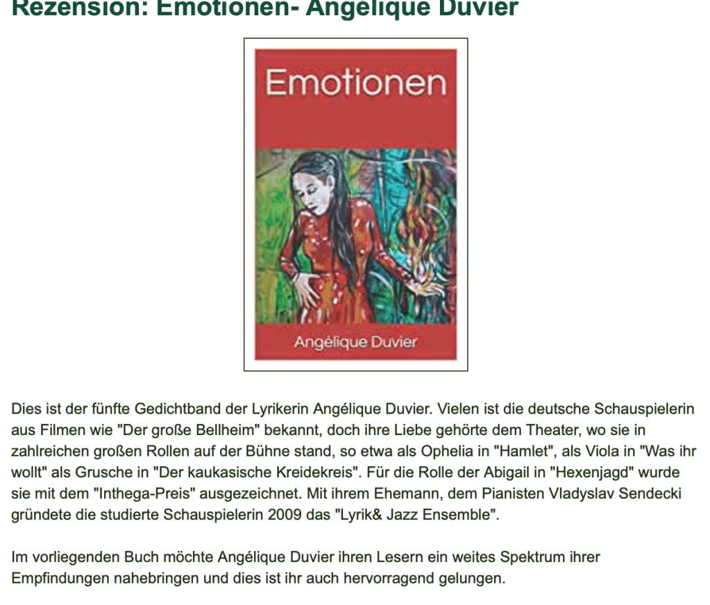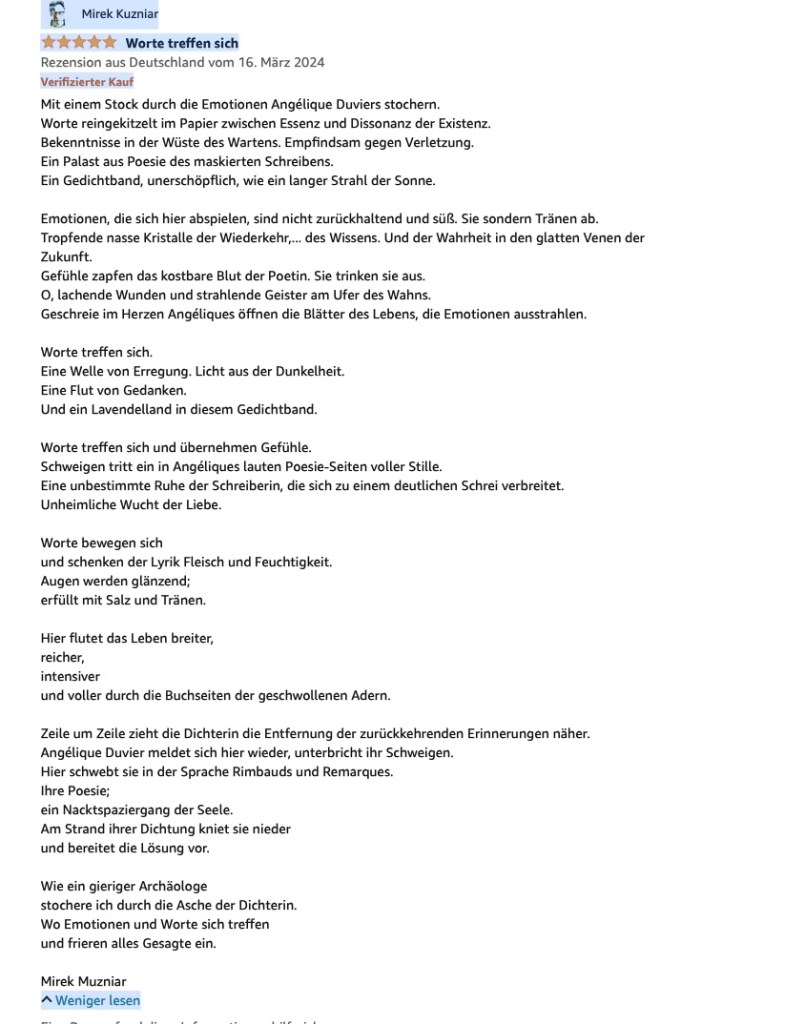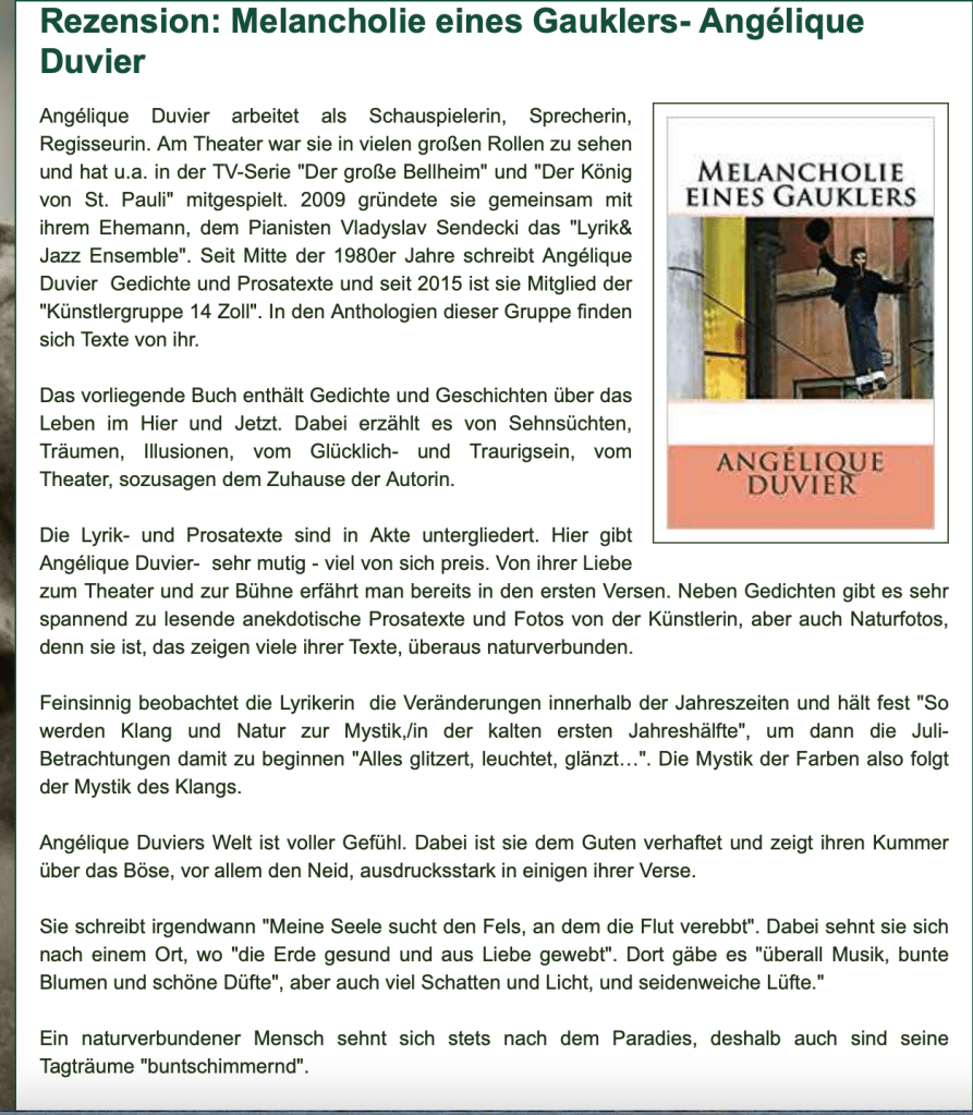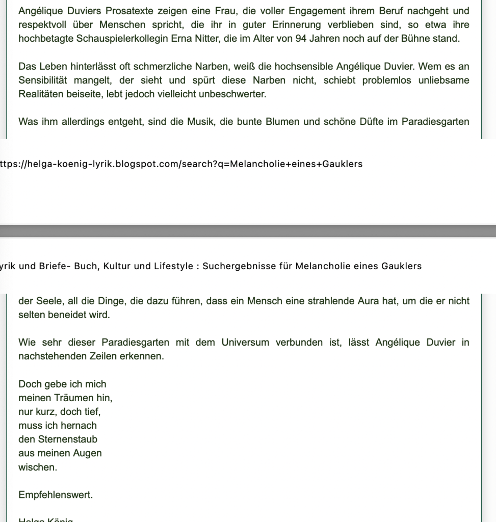 Alle Bücher von Angélique Duvier finden sie auf Amazon!„Melancholie eines Gauklers“ und alle anderen Bücher von, Angélique Duvier können sie bei Amazon bestellen.Alle Bücher von Angélique Duvier finden sie auf Amazon!Zu beziehen über Amazon!Alle Bücher über Amazon zu beziehen!Taschenbuch,Hardcover und E-Book – AmazonE-Book – AmazonDer Fünfte Freund – Kriminalroman von: Angélique Duvier, Magnus Gosdek, Heide Gerdts, Walt Reckolg – Amazon DASEIN Lyrik&Prosa – November 2023 – Hardcover und Taschenbuch – Amazon