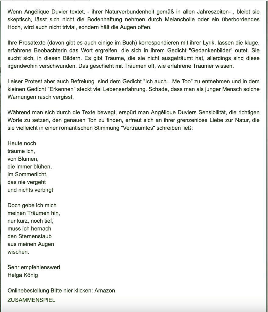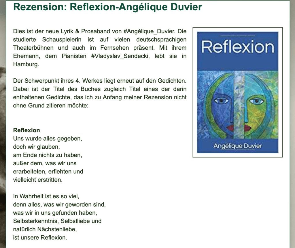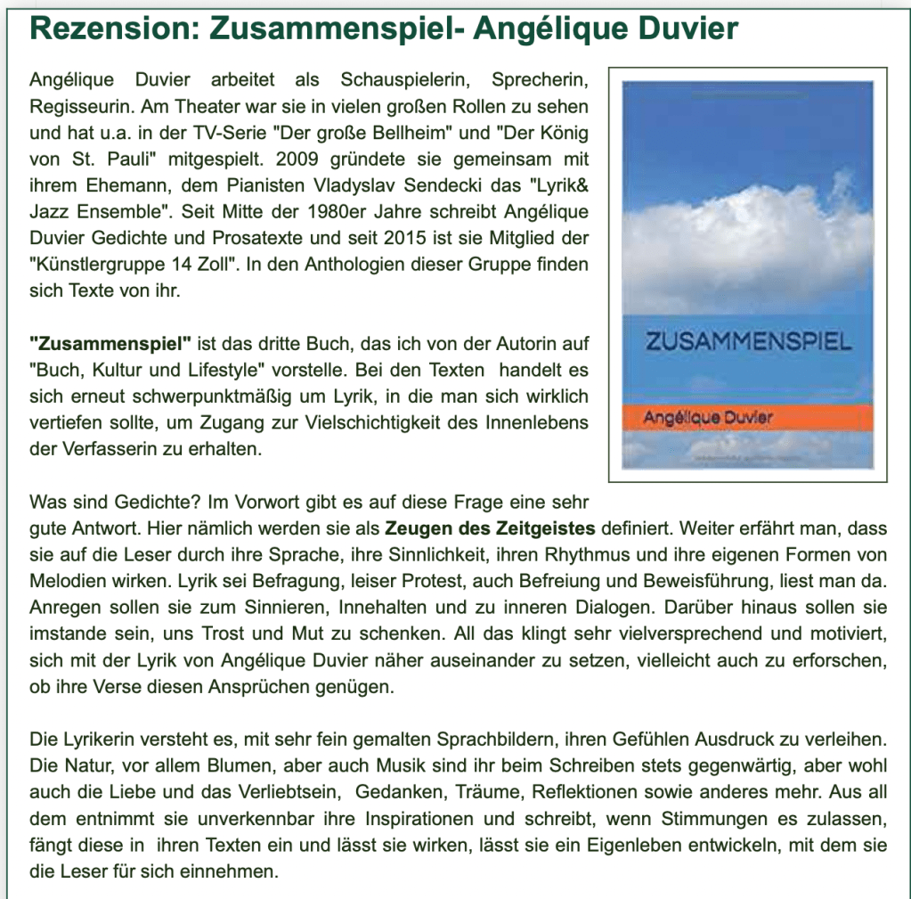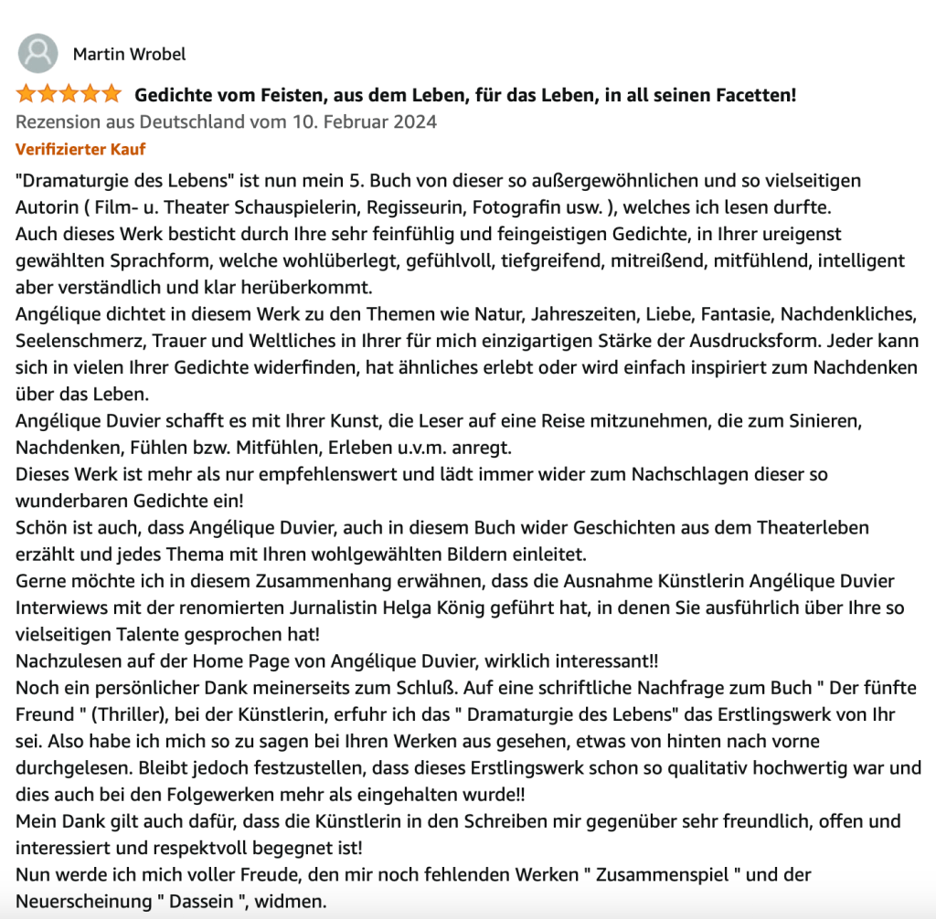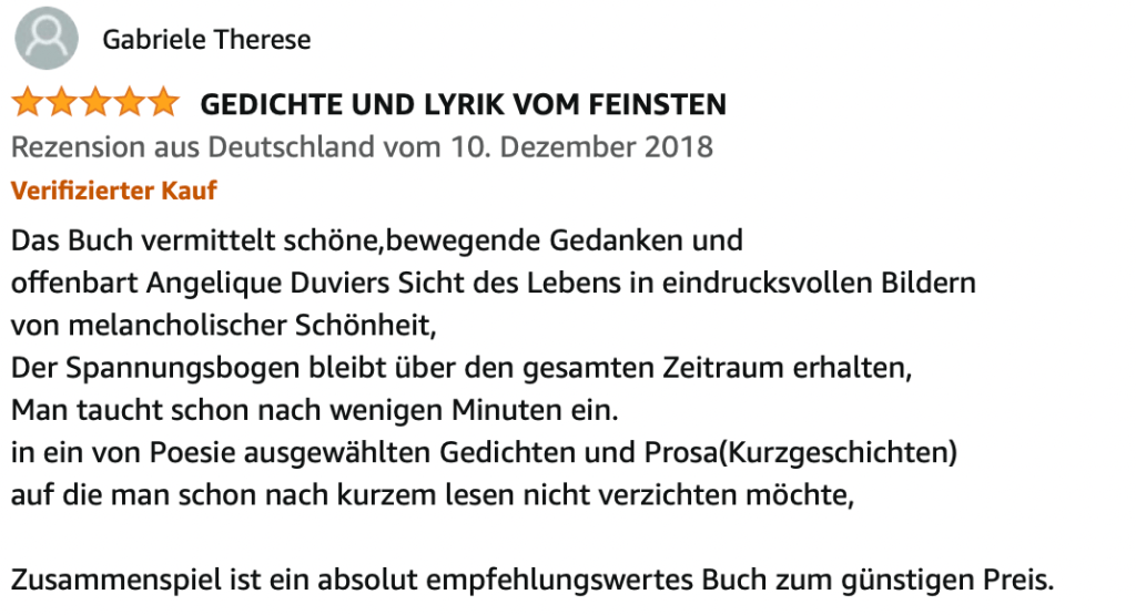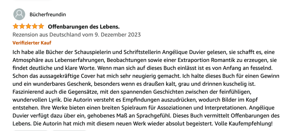 Alle Bücher von Angélique Duvier finden sie auf Amazon!„Melancholie eines Gauklers“ und alle anderen Bücher von, Angélique Duvier können sie bei Amazon bestellen.Alle Bücher von Angélique Duvier finden sie auf Amazon!Zu beziehen über Amazon!Alle Bücher über Amazon zu beziehen!Taschenbuch,Hardcover und E-Book – AmazonE-Book – AmazonDer Fünfte Freund – Kriminalroman von: Angélique Duvier, Magnus Gosdek, Heide Gerdts, Walt Reckolg – Amazon DASEIN Lyrik&Prosa – November 2023 – Hardcover und Taschenbuch – Amazon