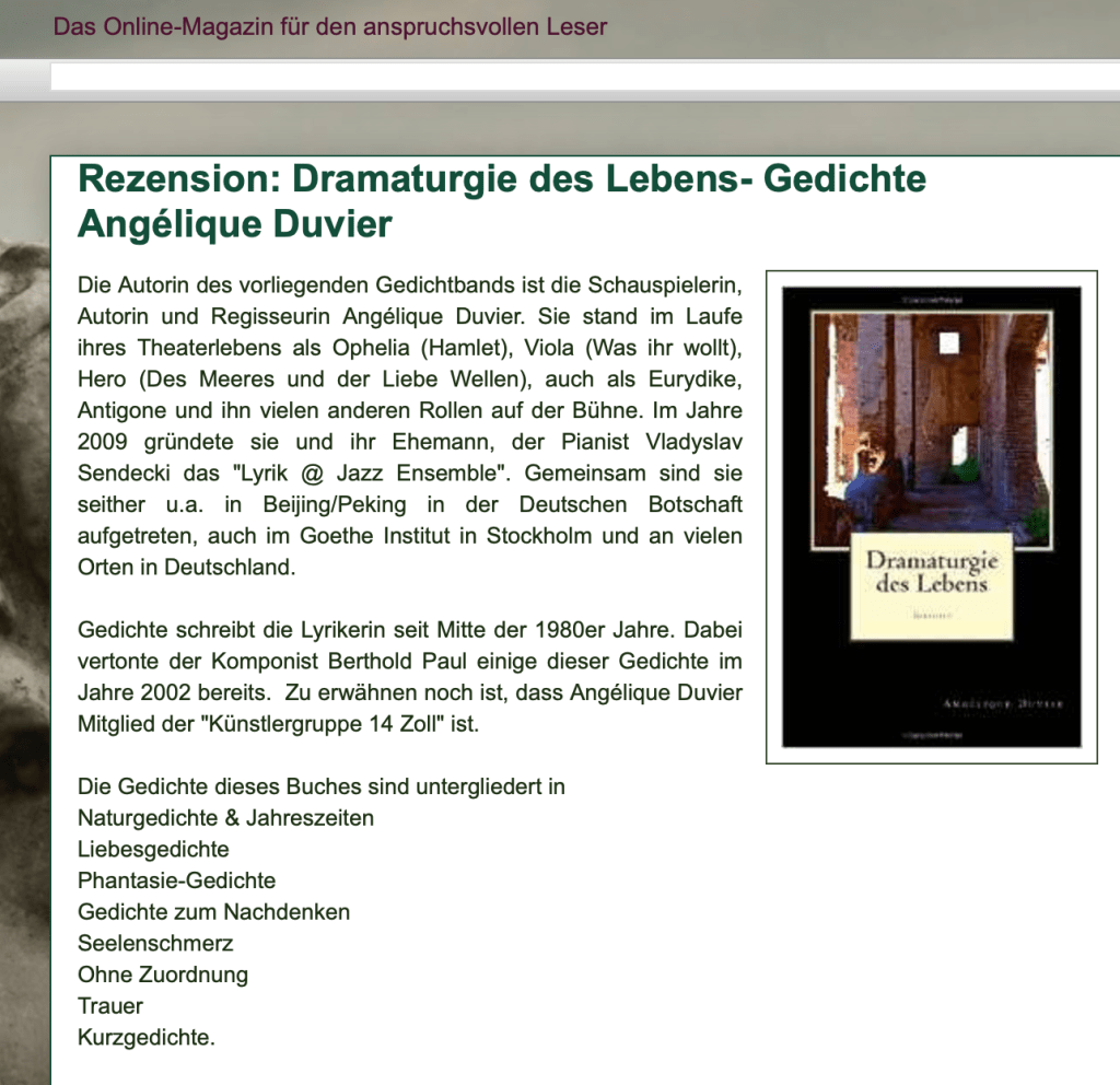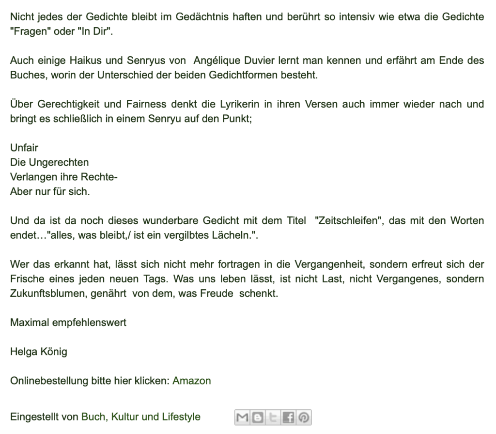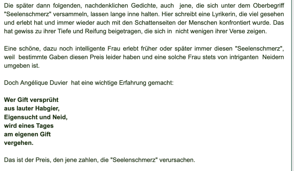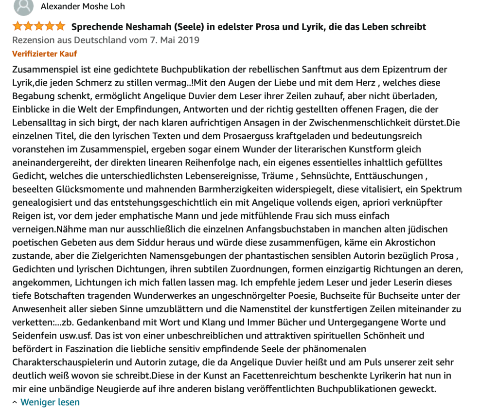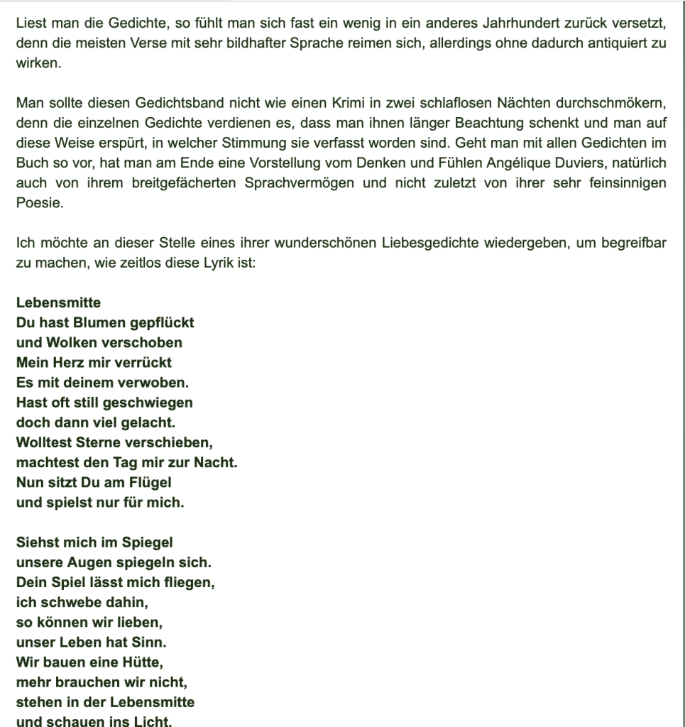 Alle Bücher von Angélique Duvier finden sie auf Amazon!„Melancholie eines Gauklers“ und alle anderen Bücher von, Angélique Duvier können sie bei Amazon bestellen.Alle Bücher von Angélique Duvier finden sie auf Amazon!Zu beziehen über Amazon!Alle Bücher über Amazon zu beziehen!Taschenbuch,Hardcover und E-Book – AmazonE-Book – AmazonDer Fünfte Freund – Kriminalroman von: Angélique Duvier, Magnus Gosdek, Heide Gerdts, Walt Reckolg – Amazon DASEIN Lyrik&Prosa – November 2023 – Hardcover und Taschenbuch – Amazon