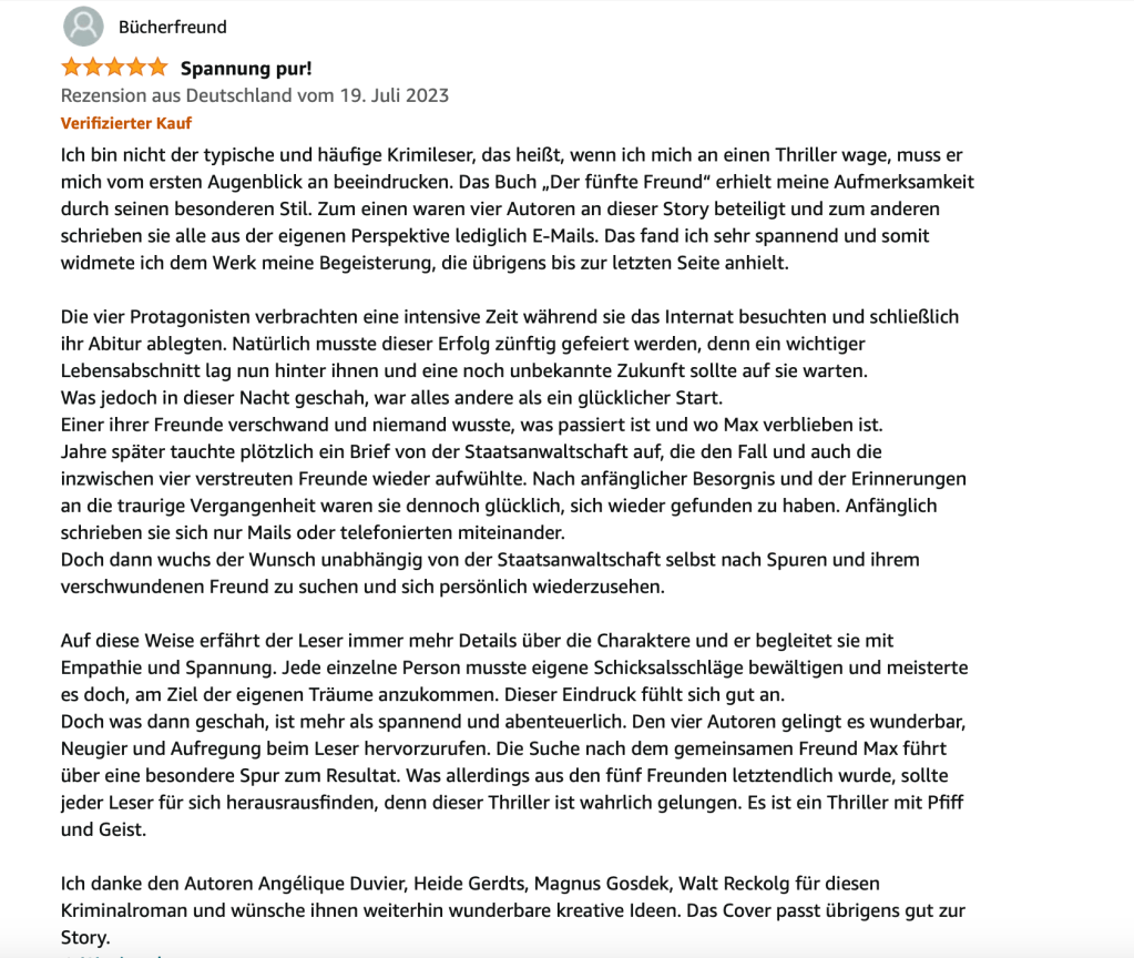 Rezension: Der Fünfte Freund – Angélique Duvier, Magnus Gosdek, Heide Gerdts, Walt ReckolgRezension: Der Fünfte FreundRezension: Der Fünfte FreundRezension: Der Fünfte Freund