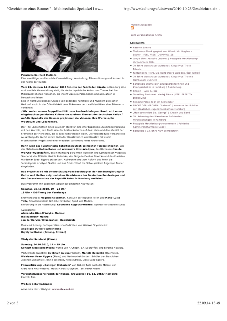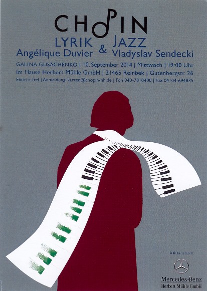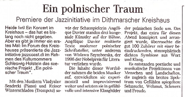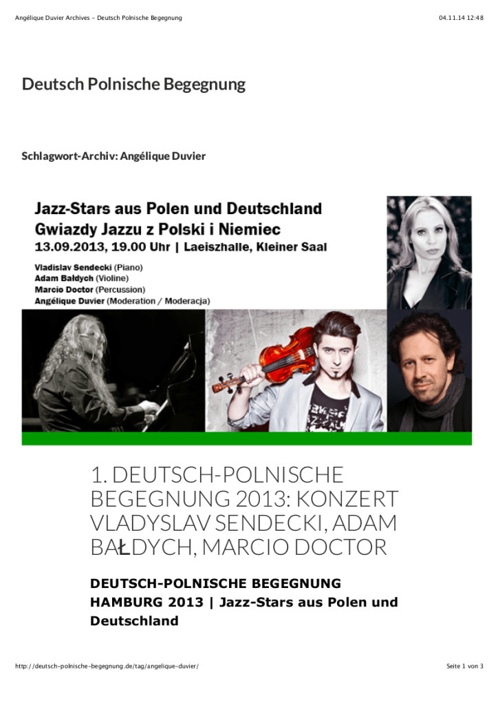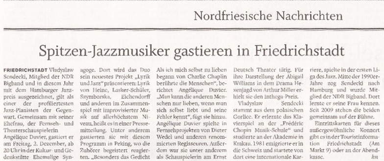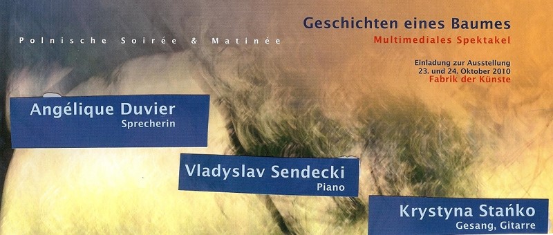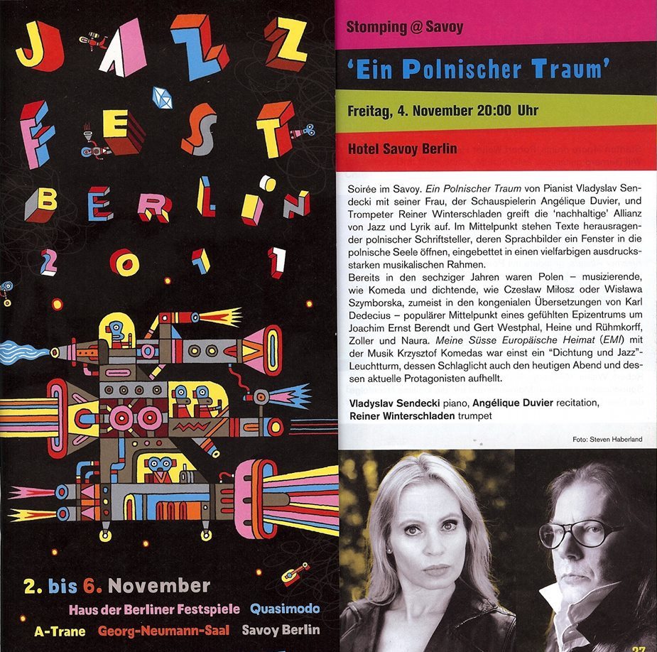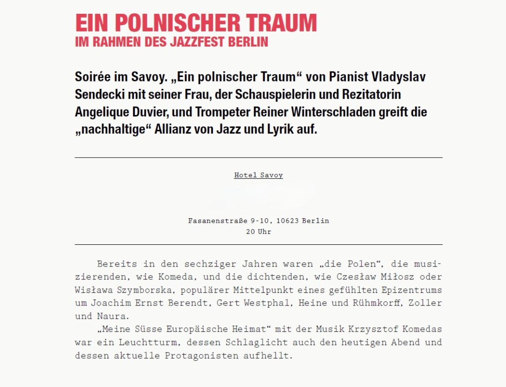 Jazz Festival Berlin Das Geschenk der Weisen – von: O.Henry – Rezitation und Regie: Angélique Duvier, Klavier und Komposition: Vladyslav Sendecki „Lyrik&Jazz Ensemble“ St. Johannis -Kirche – Hamburg Das Geschenk der Weisen – von: O.Henry – Rezitation und Regie: Angélique Duvier, Klavier und Komposition: Vladyslav Sendecki „Lyrik&Jazz Ensemble“ St. Johannis – Kirche – HamburgJoseph von Eichendorff – Rezitation: Angélique Duvier – Nysa/Polen Joseph von Eichendorff – Rezitation: Angélique Duvier – Klavier: Vladyslav Sendecki, Orchester: Opole, Gesang: Danuta Sendecka, Marek Balata, Komposition: Stefan Sendecki. Conductor: Piotr Baron – Nysa/Polen